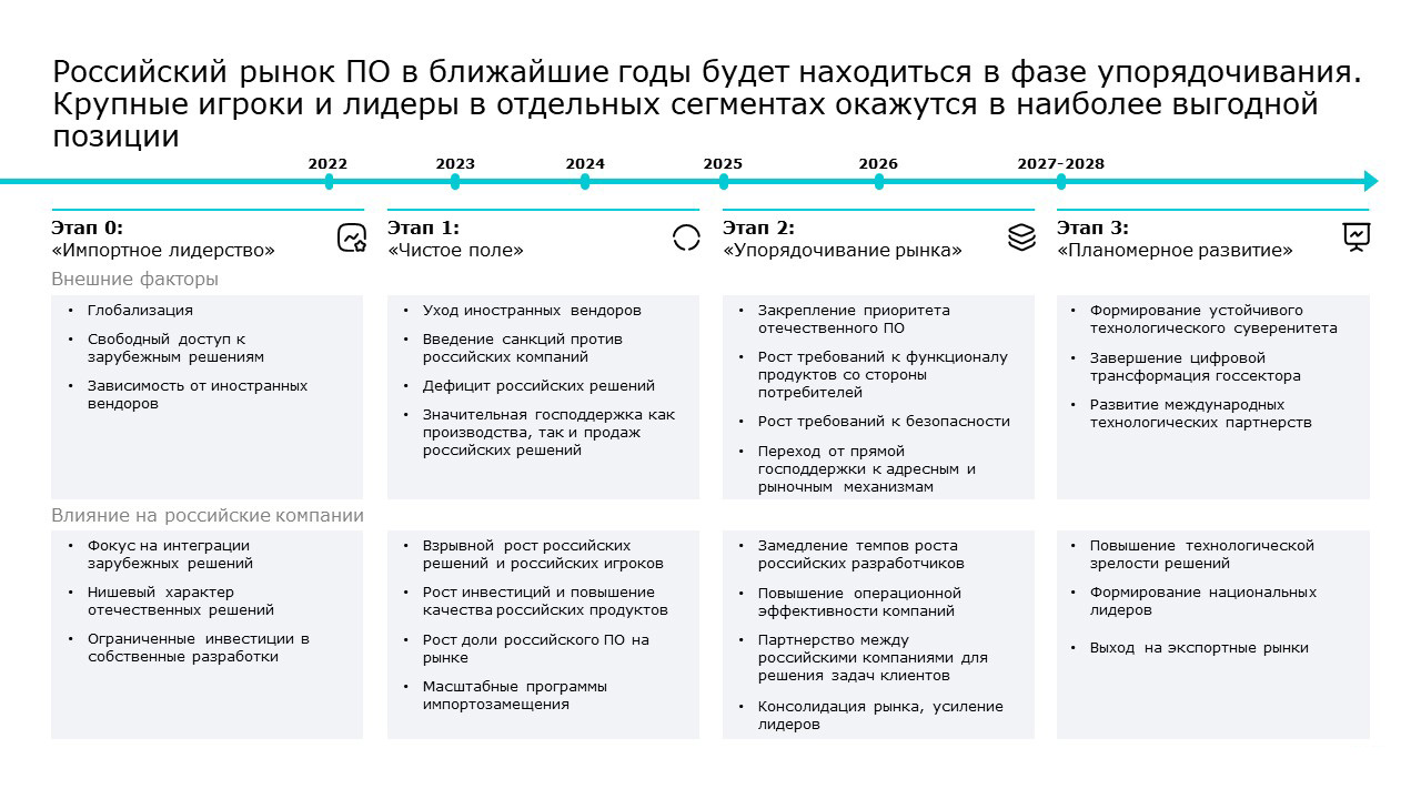 Для текущей стадии рынка характерны рост требований к функционалу продуктов со стороны потребителей, развитие партнёрств между российскими компаниями для решения задач клиентов, замедление темпов роста выручки российских разработчиков, консолидация и усиление позиций лидеров. На фазе упорядочивания рынка усиливаются требования к безопасности со стороны потребителей, господдержка отрасли переходит на адресные и рыночные механизмы.